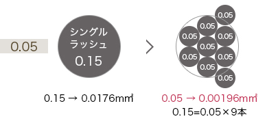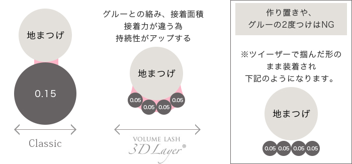 新技術の3Dアイラッシュ、0.05mmと細いアイラッシュを束に入れてナチュラルな目元からゴージャスな目元まで自由自在です。